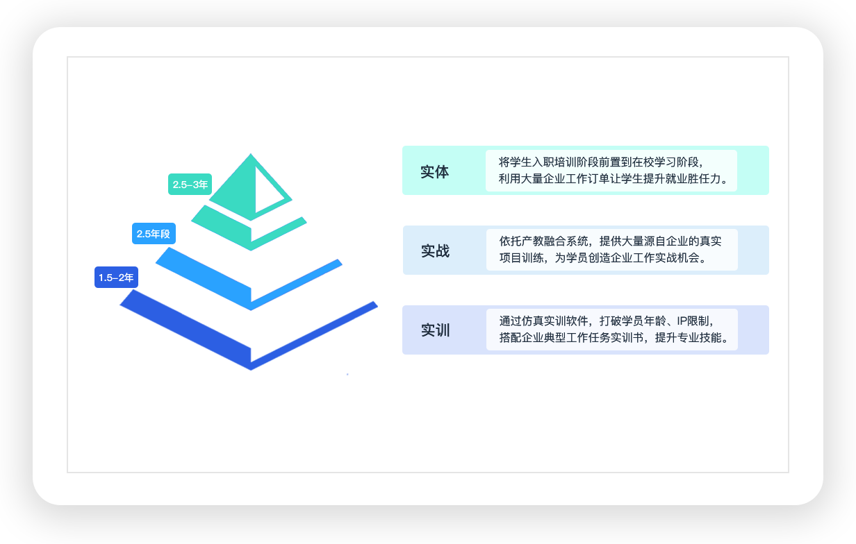 方案价值 书证融通 将1+X证书培训课程有机融入学历证书课程,既满足学历教育,又满足证书培训考核。 了解更多 产教融合 通过引入企业、引入项目、引入课程、引入师傅,连接企业与院校,促进产教融合。 了解更多 三教改革 双师直播大班课+模块化活页教材+混合式教学,通过AI全场景智能教学平台,实现教师、教材、教法“三教改革”。 了解更多 数字生态 构建“1+3+N+X”职教大脑测评系统数字生态系统,打通教育链、人才链、产业链,实现人才精准培养与精准就业。 了解更多