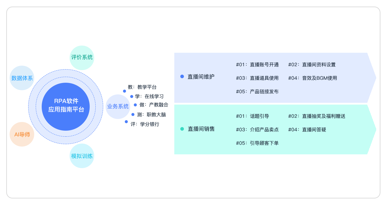 RPA软件应用指南平台(Robotic process automation)能够代替并协助教师/学生在虚拟仿真实训或实战教学过程中完成工作与任务。软件与RPA指南平台结合能够大大提升实训效果,特别能够大大降低新职业对双师实战能力的要求。